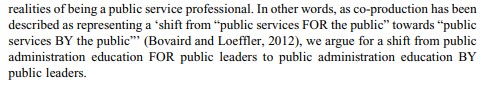 The use of curriculum co-design in the classroom is particularly beneficial in public administration programmes as co-production has become an influential practice in public services across the UK. In England this is part of a shift in how public services are designed and delivered through the localism agenda. Examples include the development of combined authorities and elected mayors. In Scotland co-production is one of the key pillars of the Scottish Approach to Public Administration as seen in community empowerment. This is part of a wider trend within public administration which has seen a shift from direct top-down delivery of services through to outsourcing and privatisation and now to increasing collaboration, coproduction and co-design of our public services.